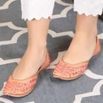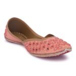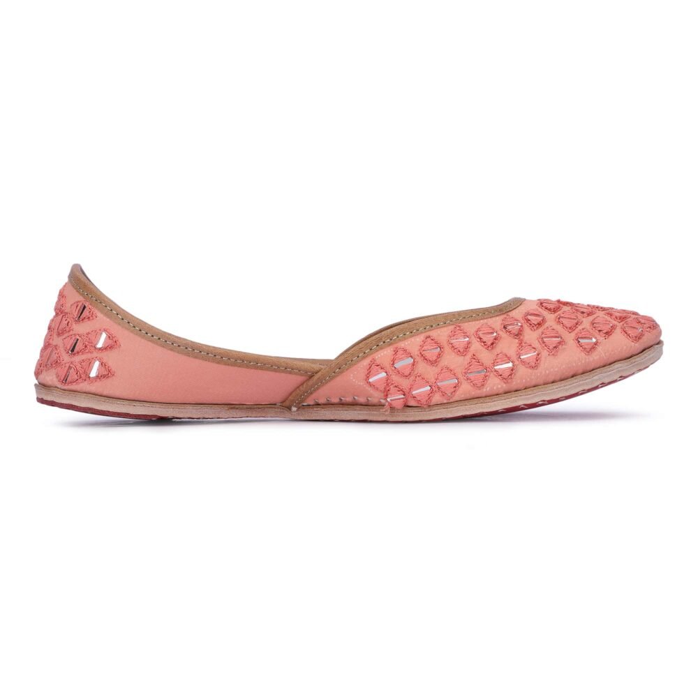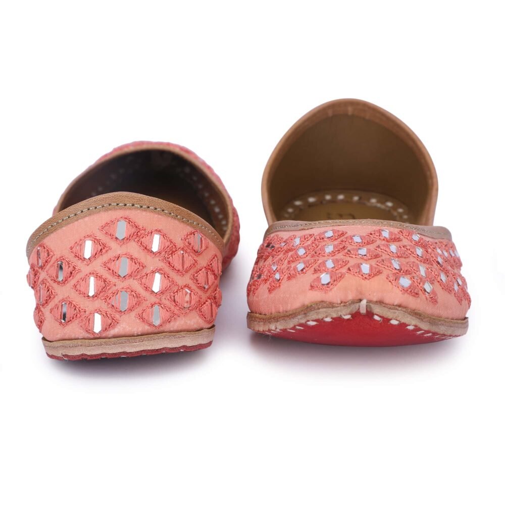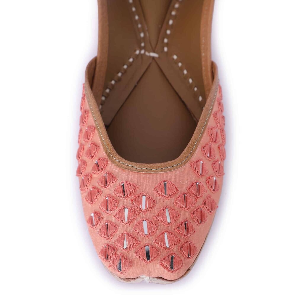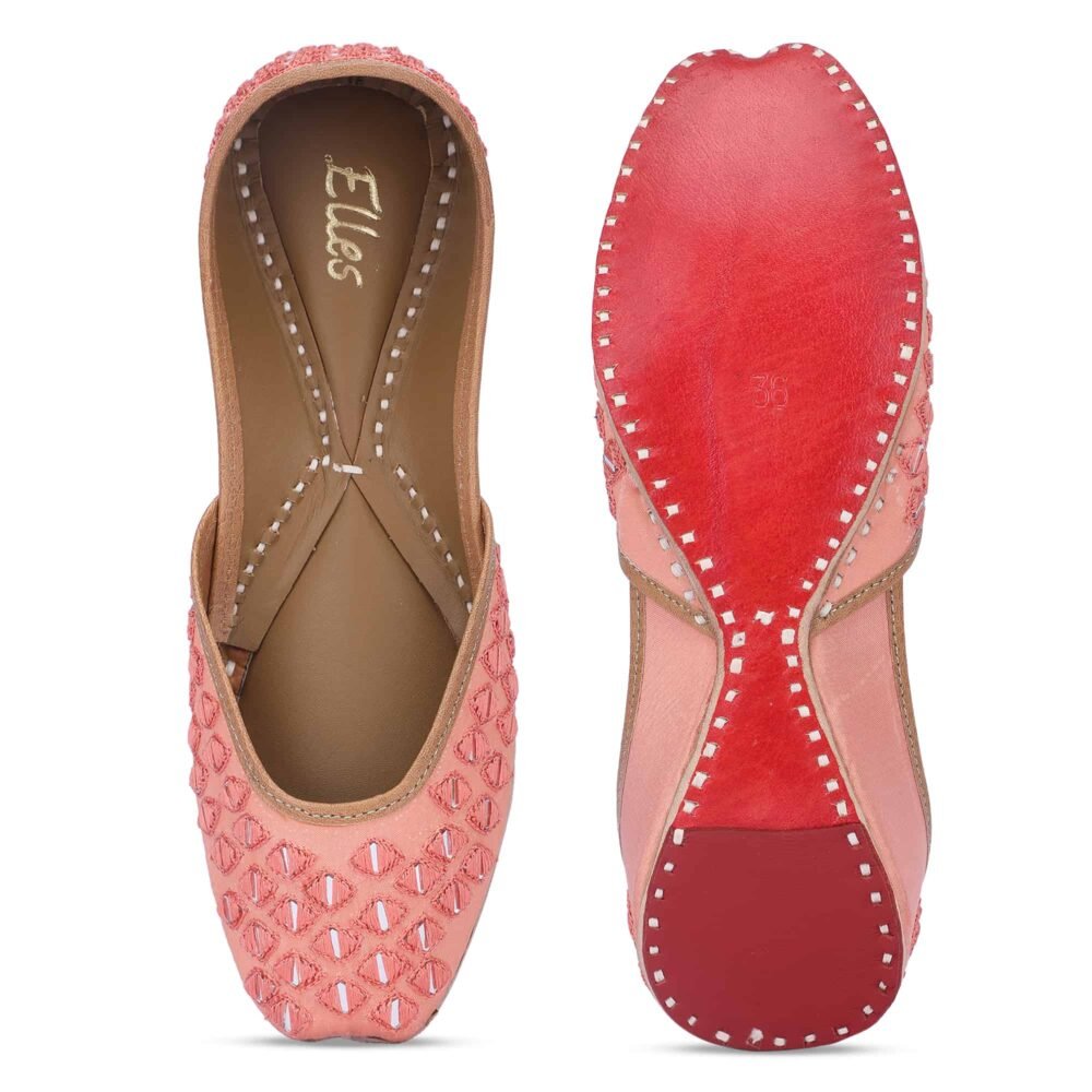 A very elegant pair of juttis with soft pink colour recreating starburst mirrors effect with threads and mirrors. You can style these with classic indian anarkali suits.