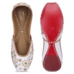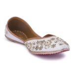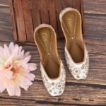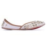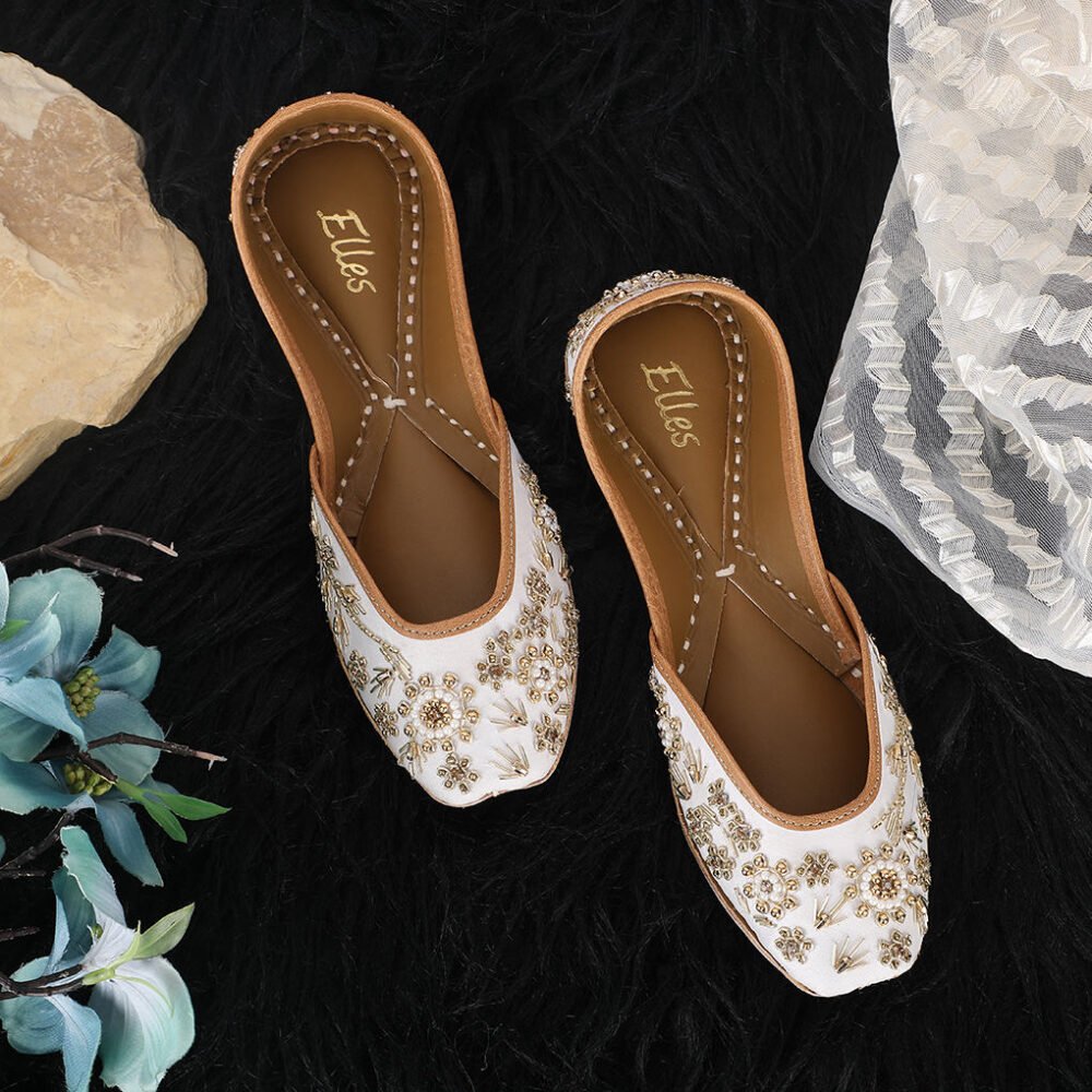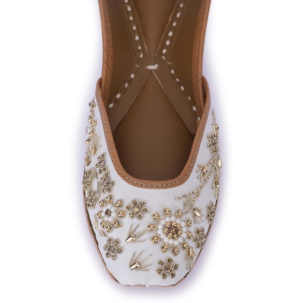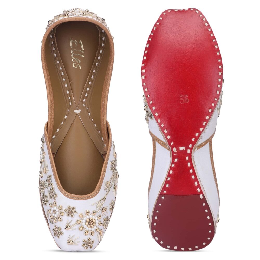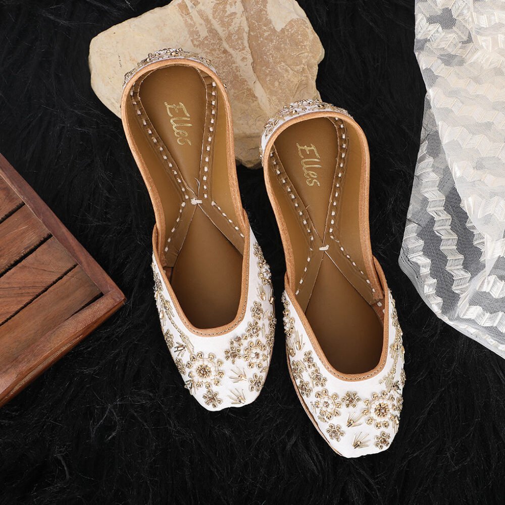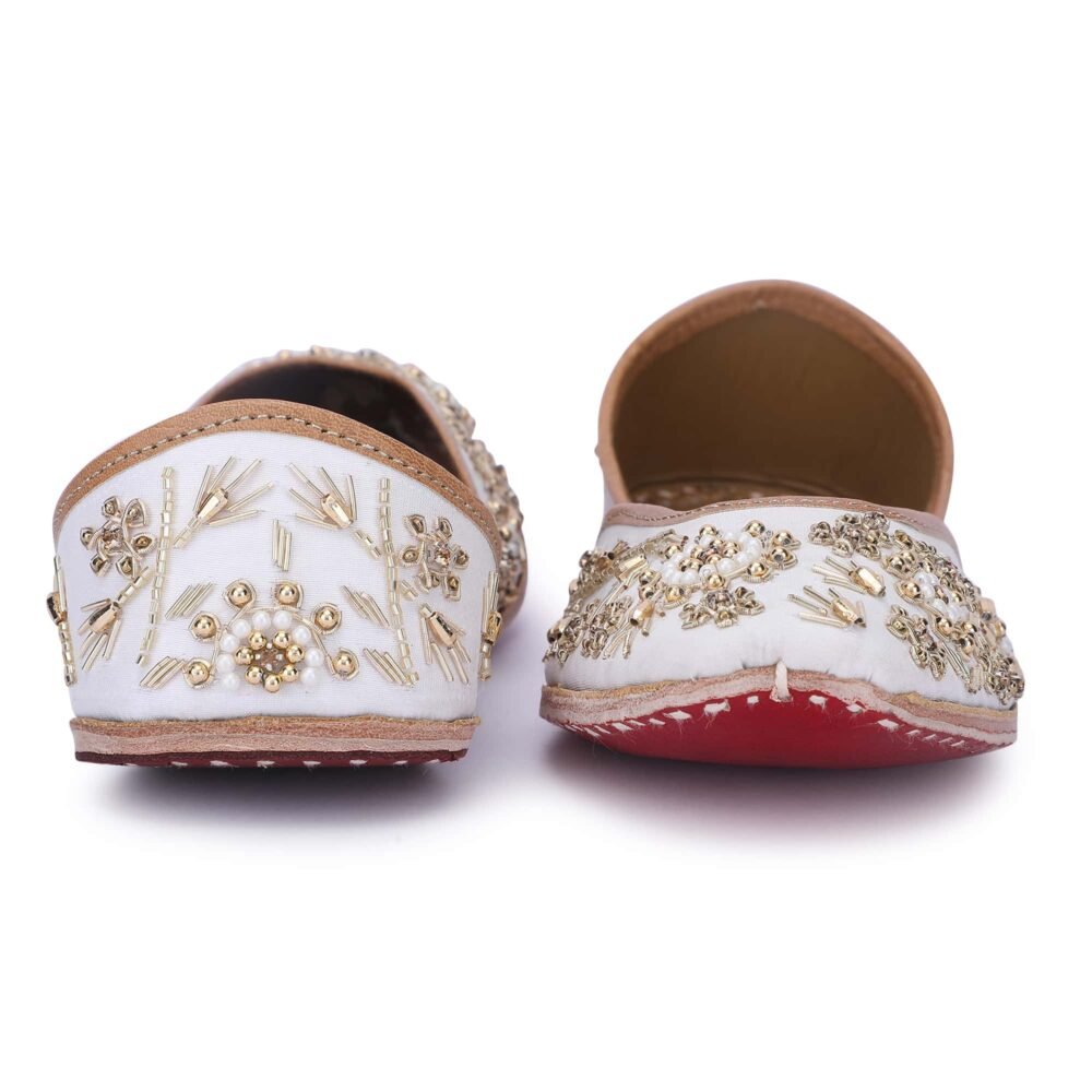 White Juttis with golden beads with pearls detailing giving a very magical finish. It would go perfectly with any of your delicate day outfits