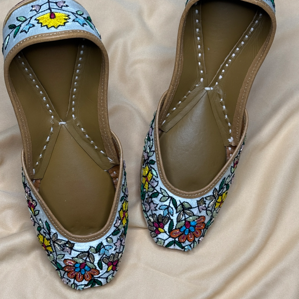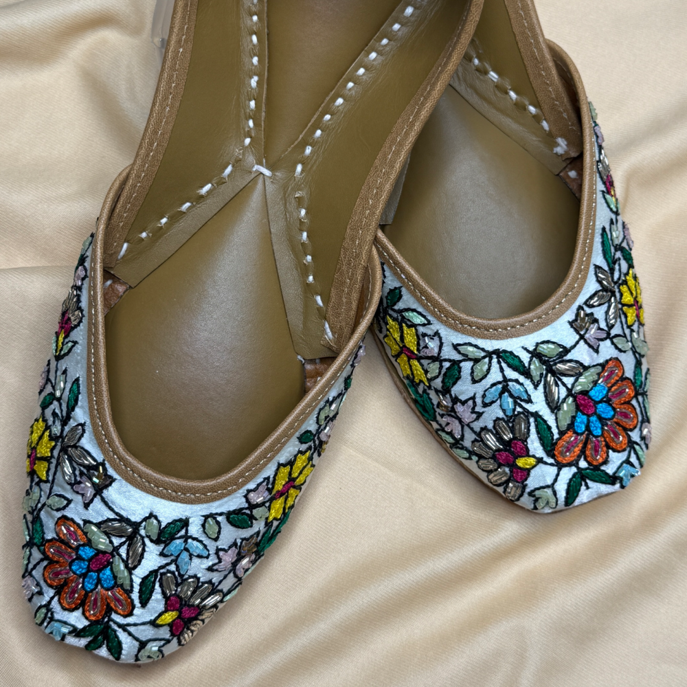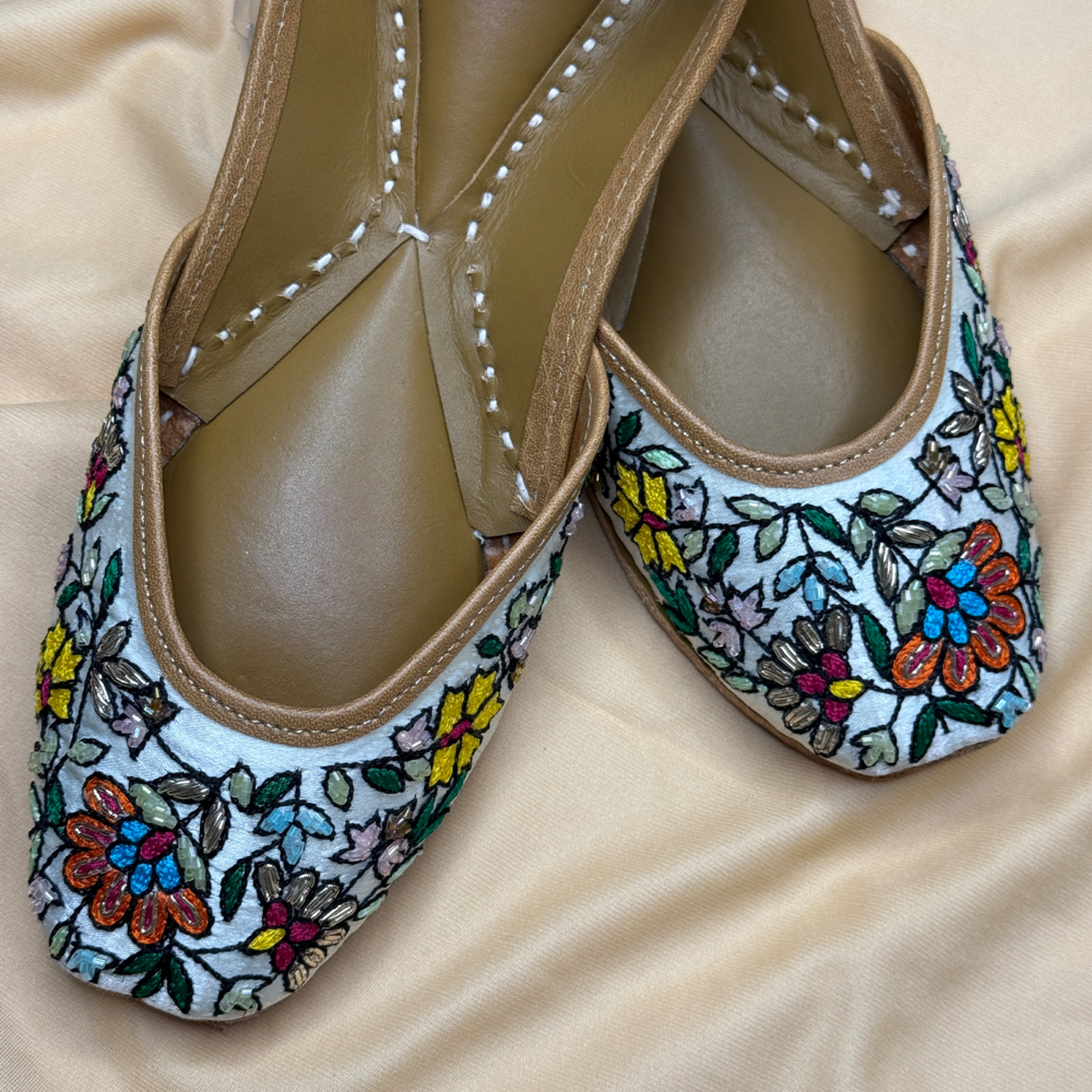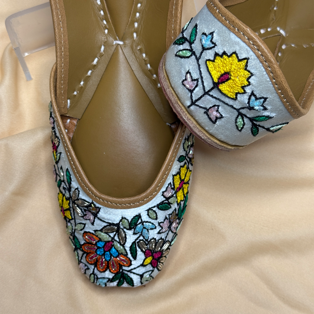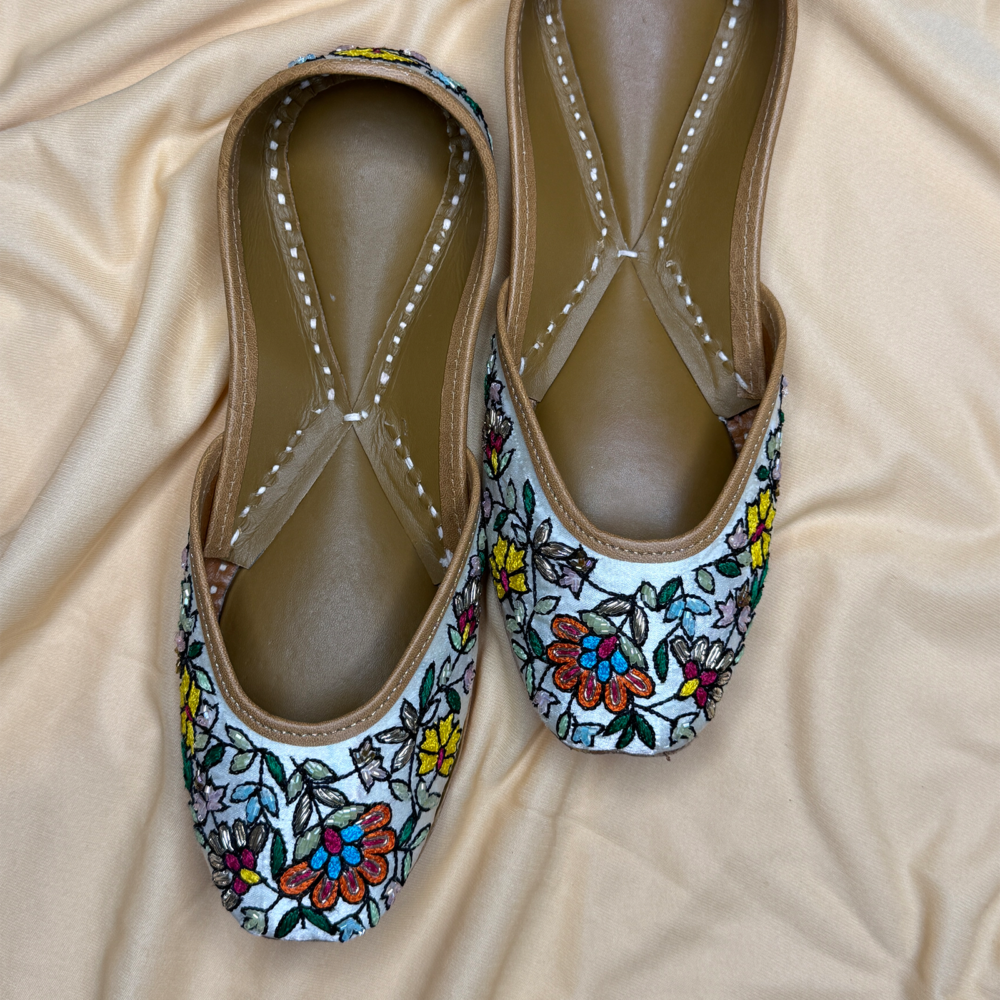Garden Whispers brings a meadow to your feet – a handcrafted jutti alive with vibrant hand embroidery and blooming florals. Each stitch tells a story of artistry and joy, making it your go-to pair for adding color, charm, and tradition to every step.
