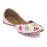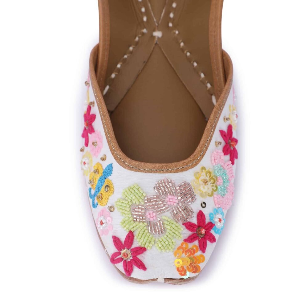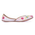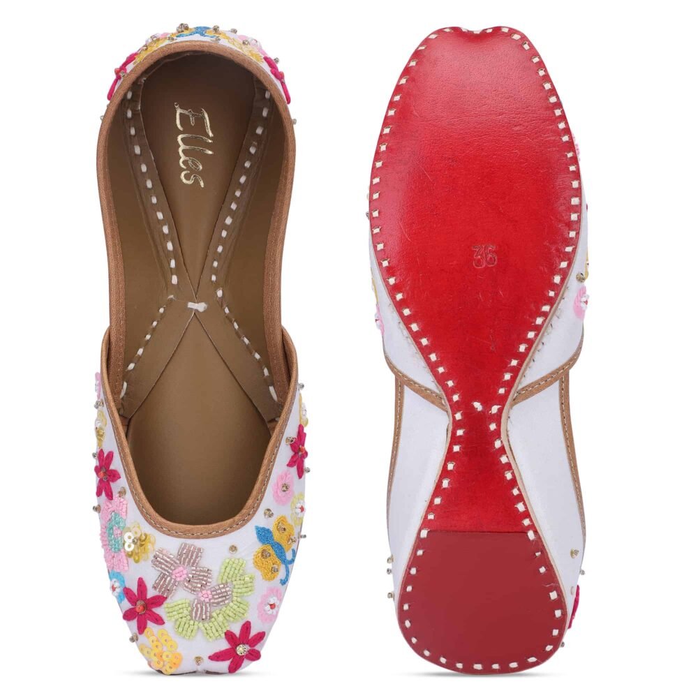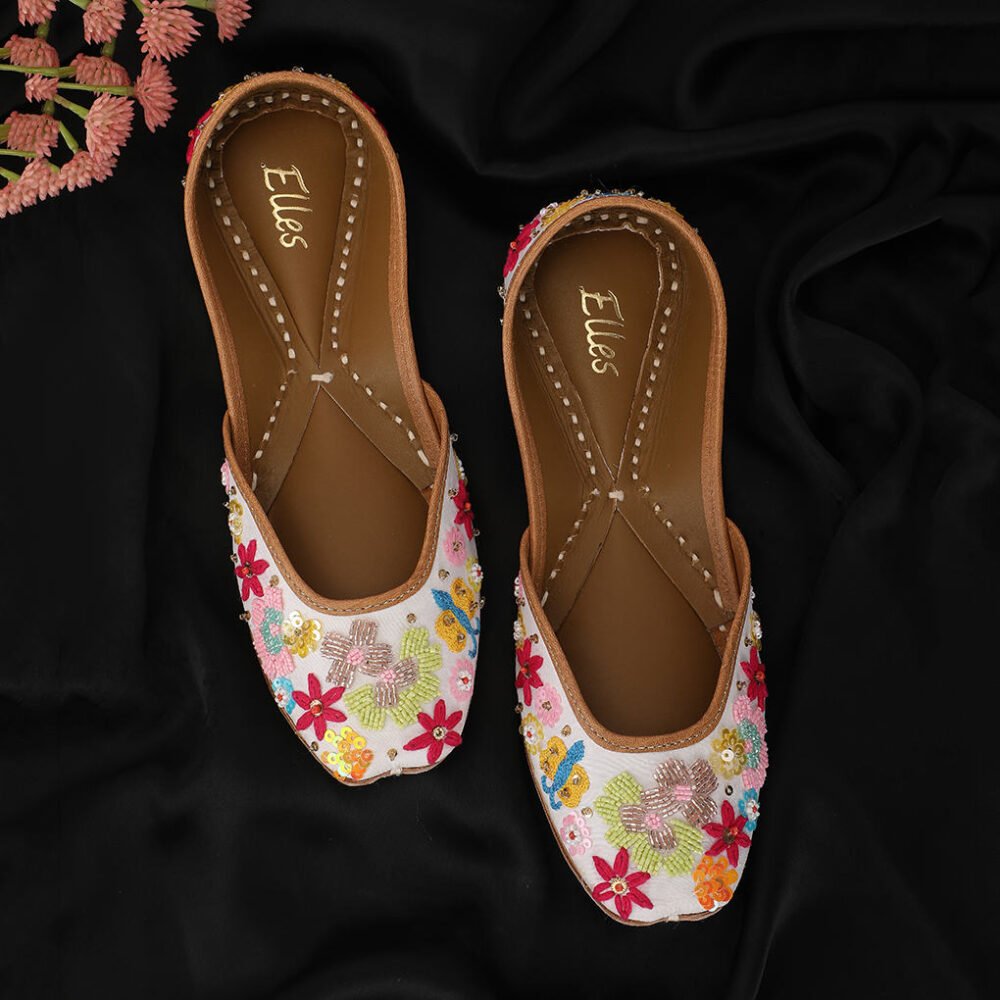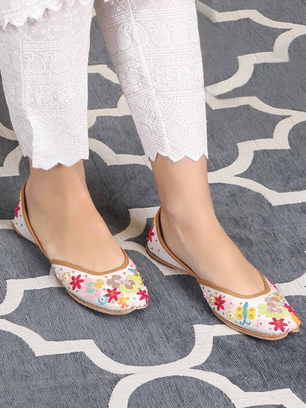 White Juttis with multi-coloured floral magnificence is beyond perfect for all your autumn-winter Indian looks.