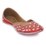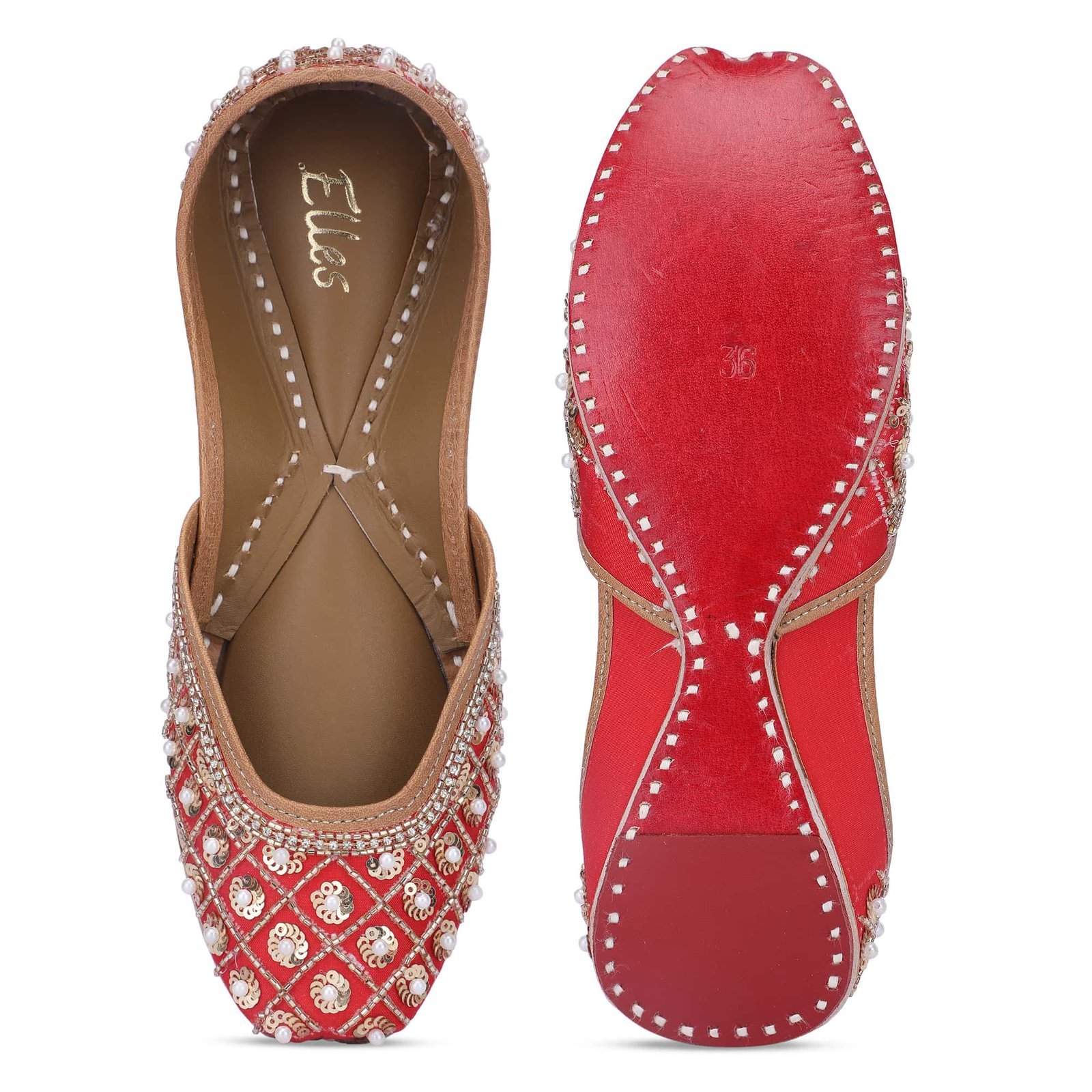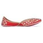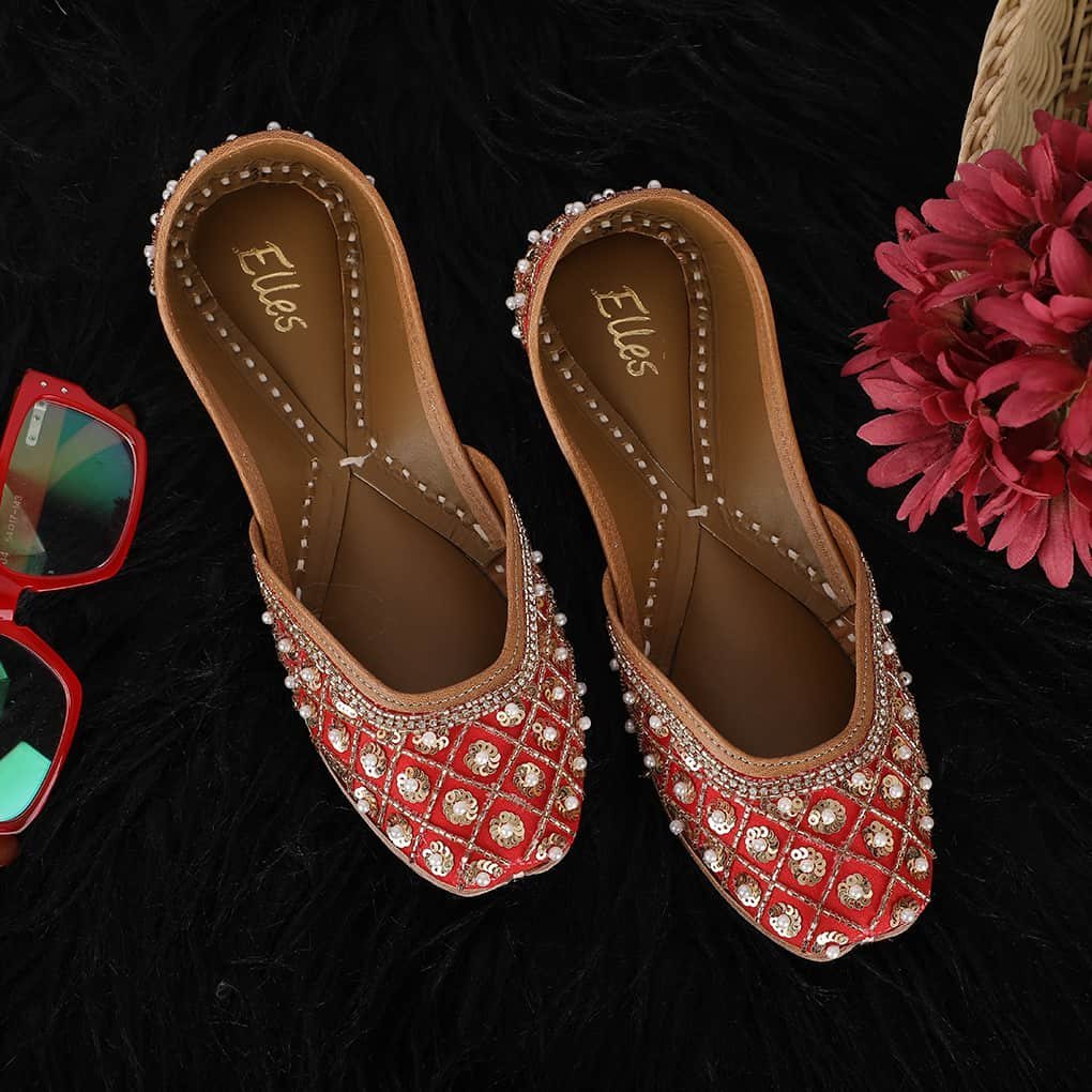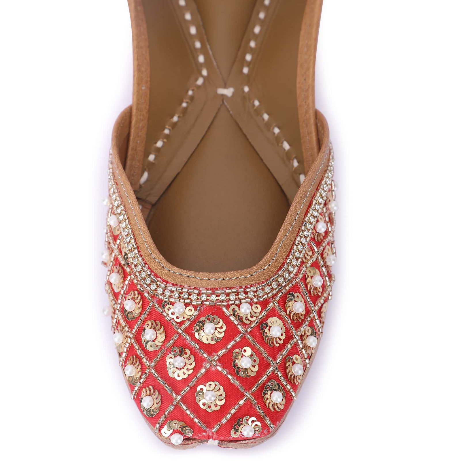 • Perfect red bridal juttis with gold embroidery and pearls for a stunning wedding look.