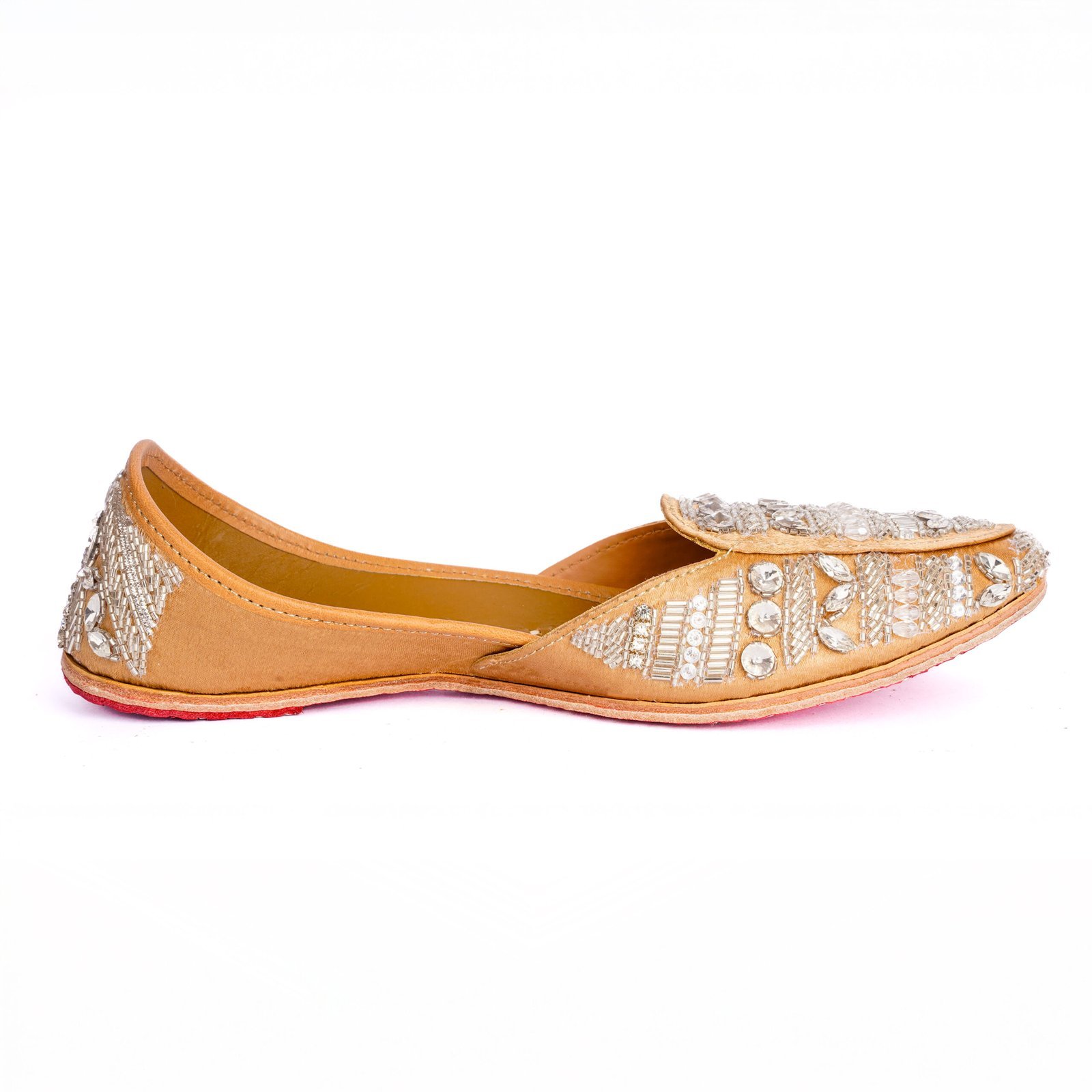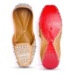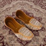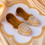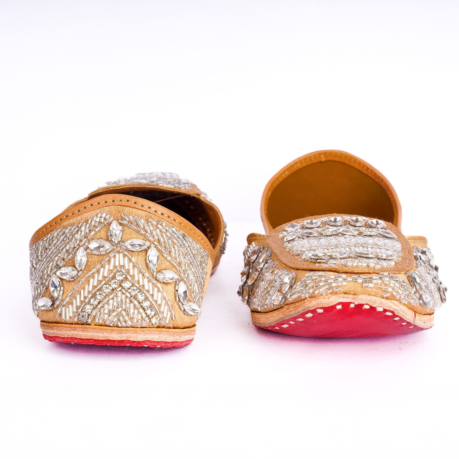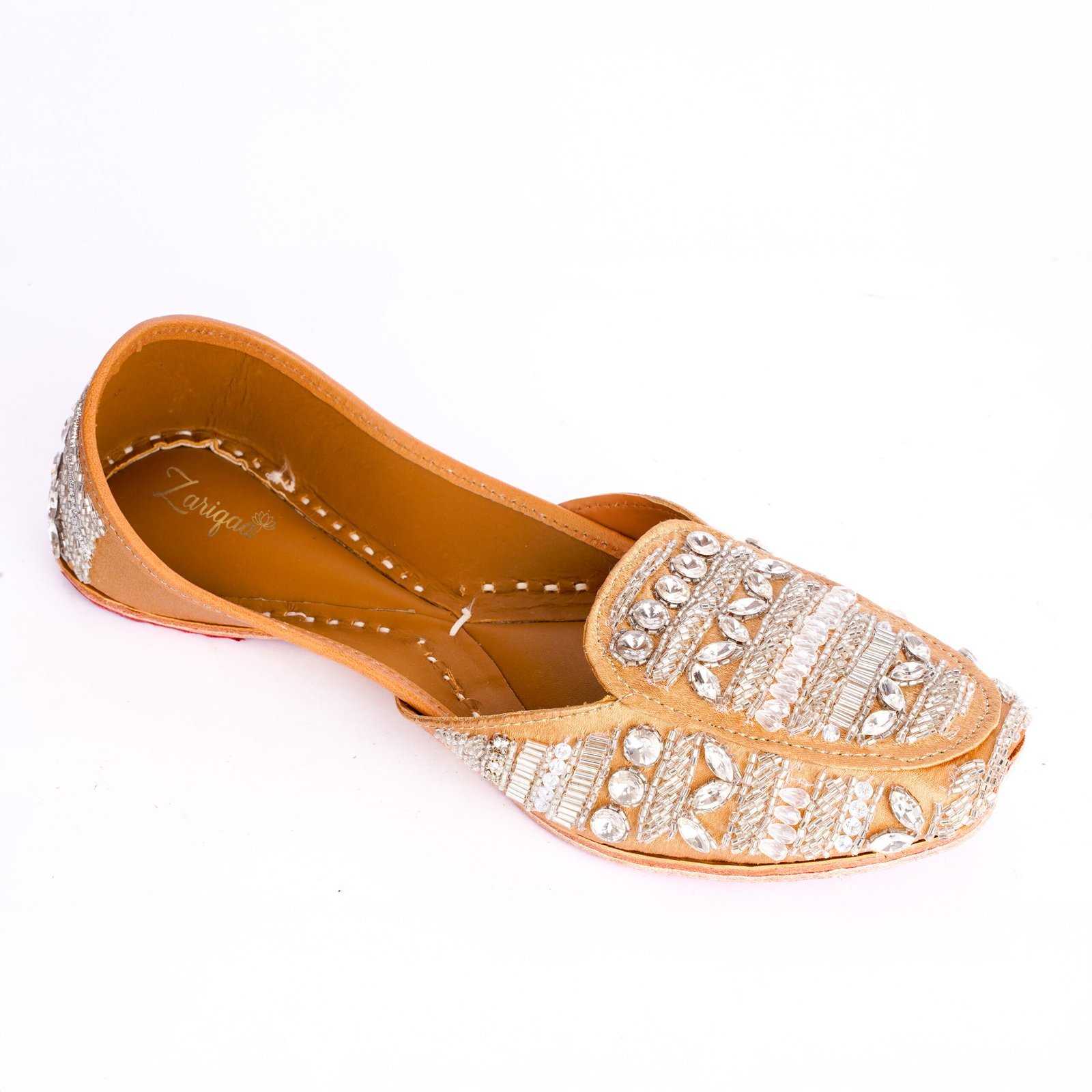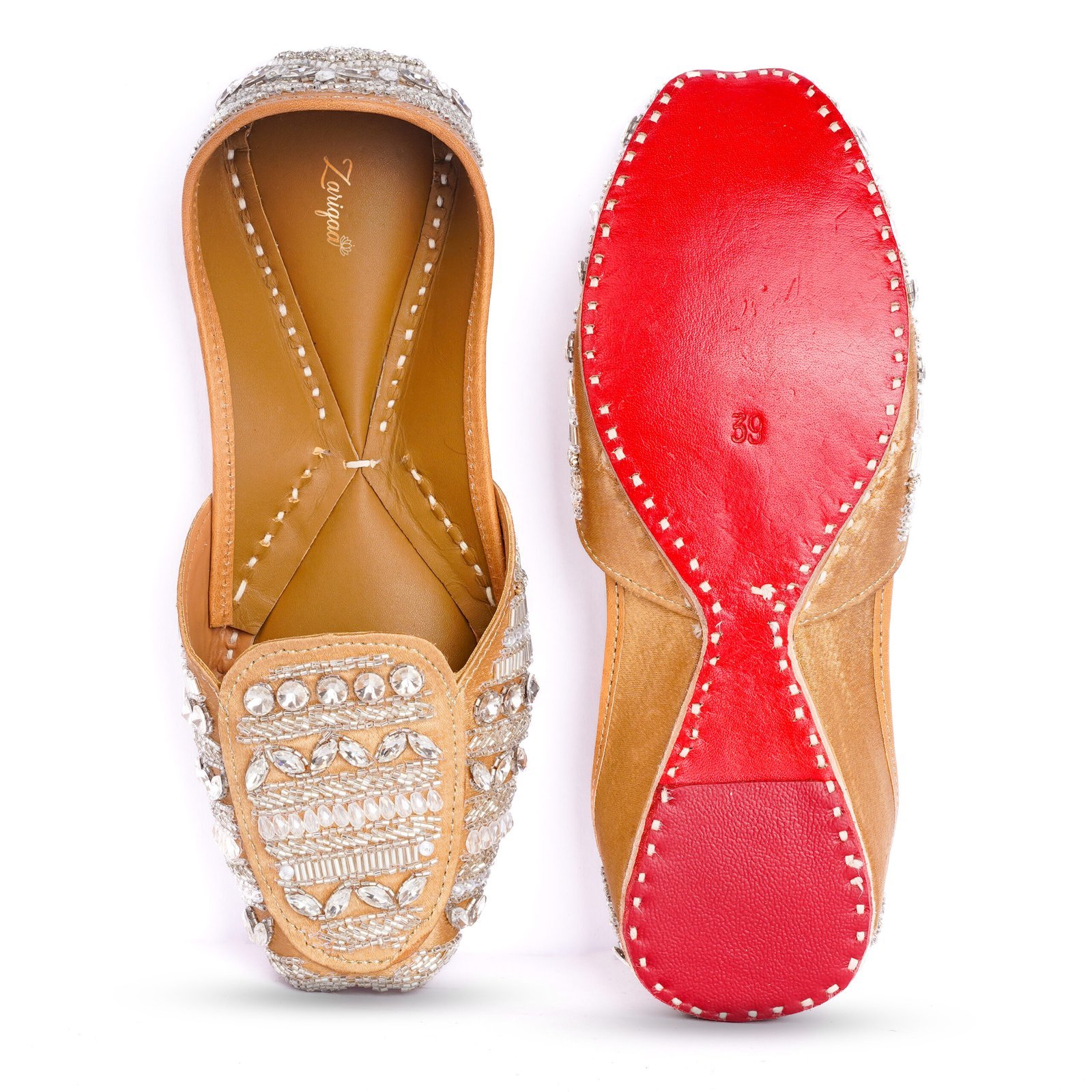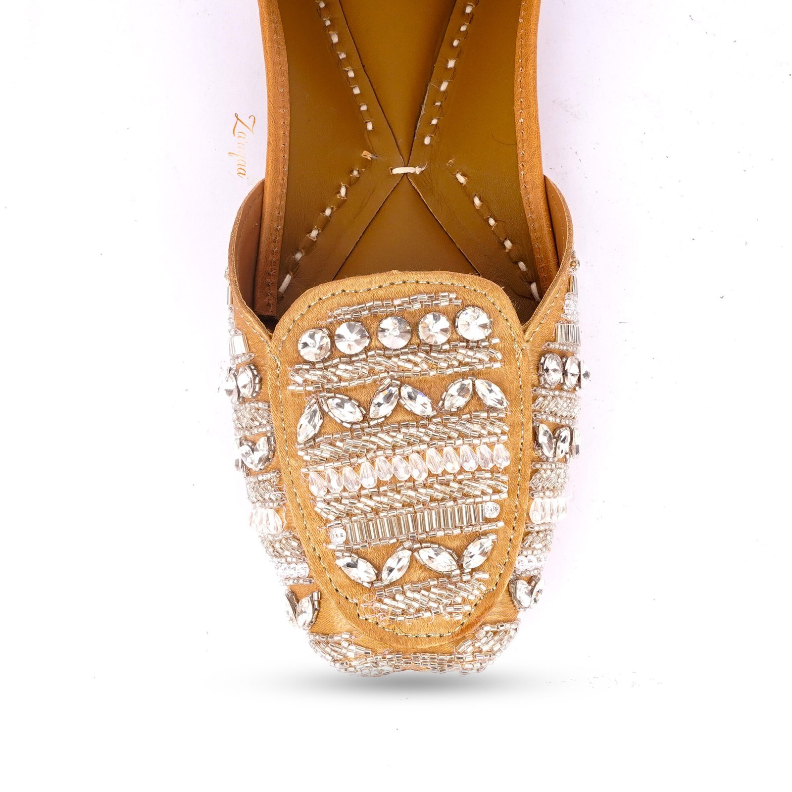 Zariqaa lightweight, flat loafer-style juttis with comfortable cushioned leather insole. Handcrafted heavy stone and pipe beaded detailing makes them ideal for versatile fashion footwear for bridal, parties, travel, and family gatherings and gifting loved ones.