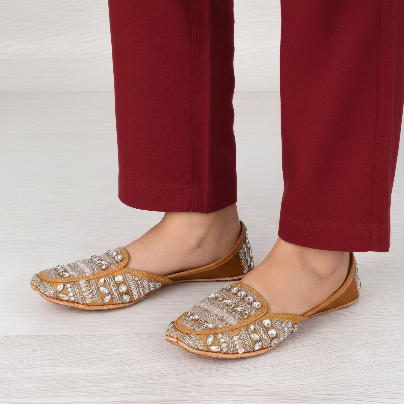 Zariqaa Heavy White Stone Embroidered Brown Flat Loafer Jutti: