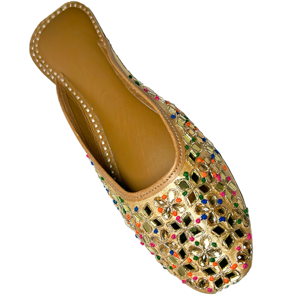 Must have golden slip on mules embroidered with multi coloured thread and reflective mirrors.