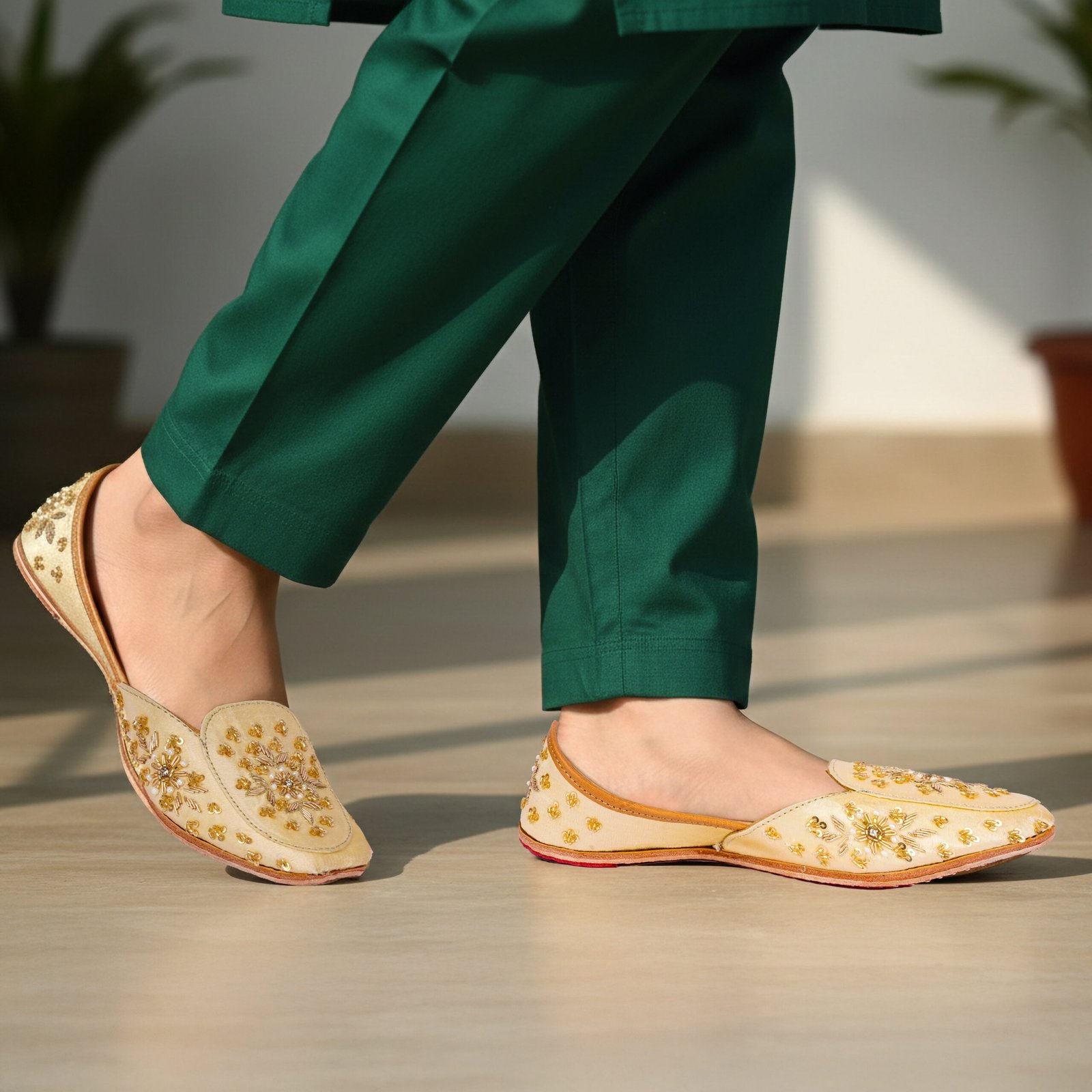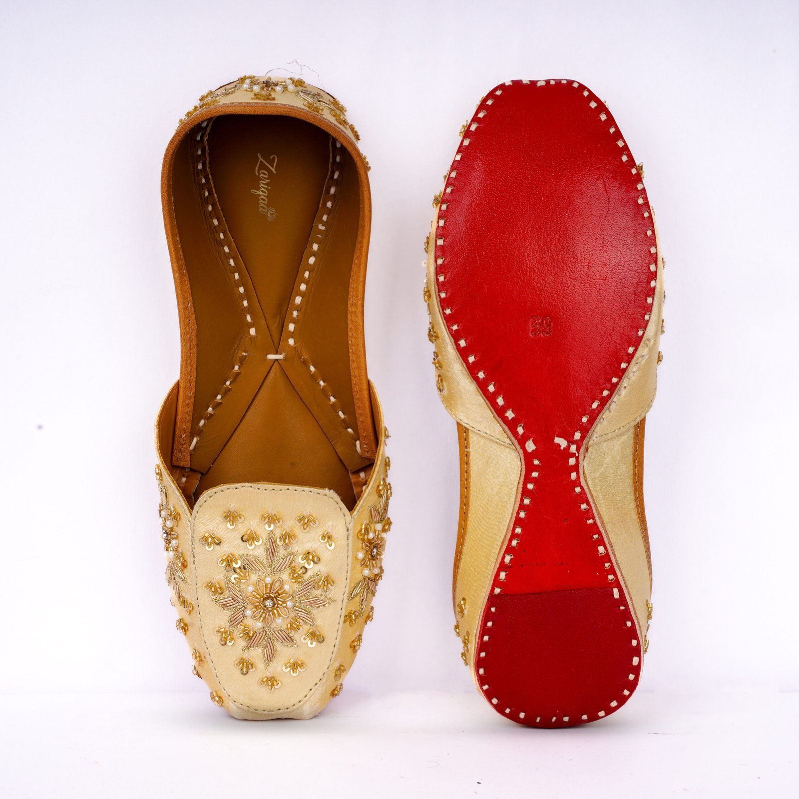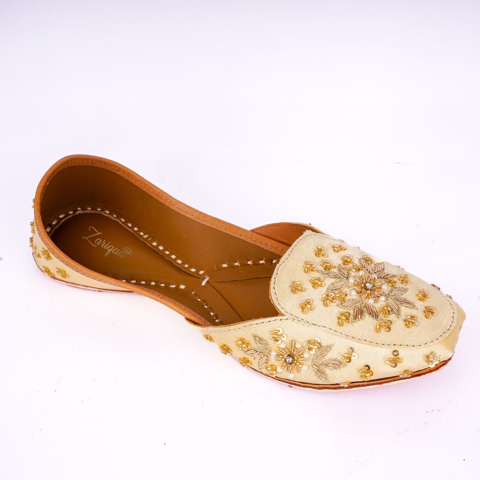 Zariqaa handmade heavy sequins embroidered, white moti & golden zari loafer jutties combine ethnic elegance with modern comfort. Perfect for bridal, mehendi, haldi, or casual festive wear.