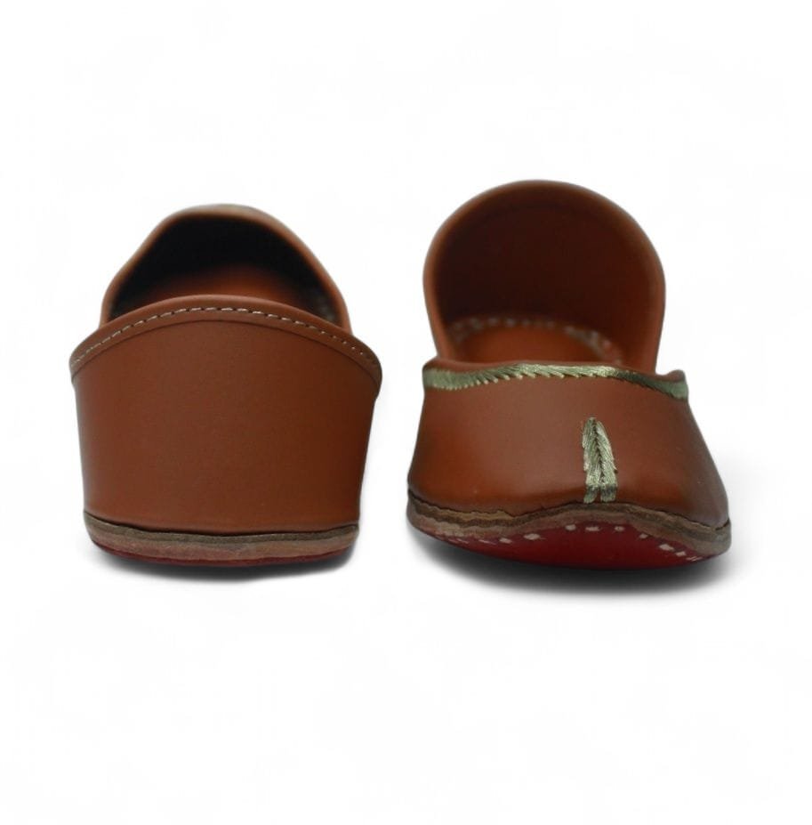 Product Care Guide: Keep juttis clean by wiping with a soft dry cloth, avoid moisture, store in an airy bag, and let them breathe after use. Prevent contact with harsh chemicals to maintain leather shine and embroidery quality. Handcrafted in India.